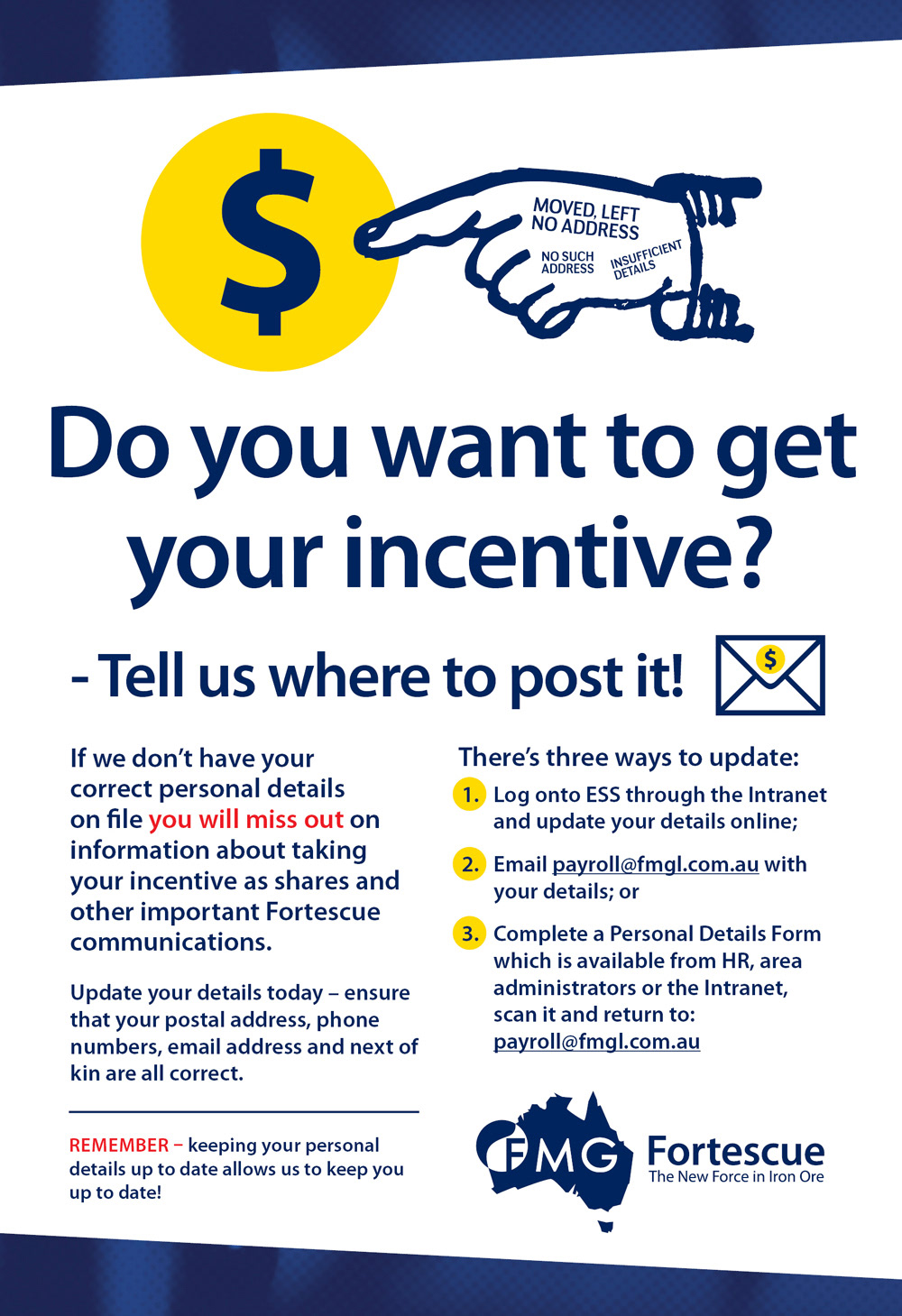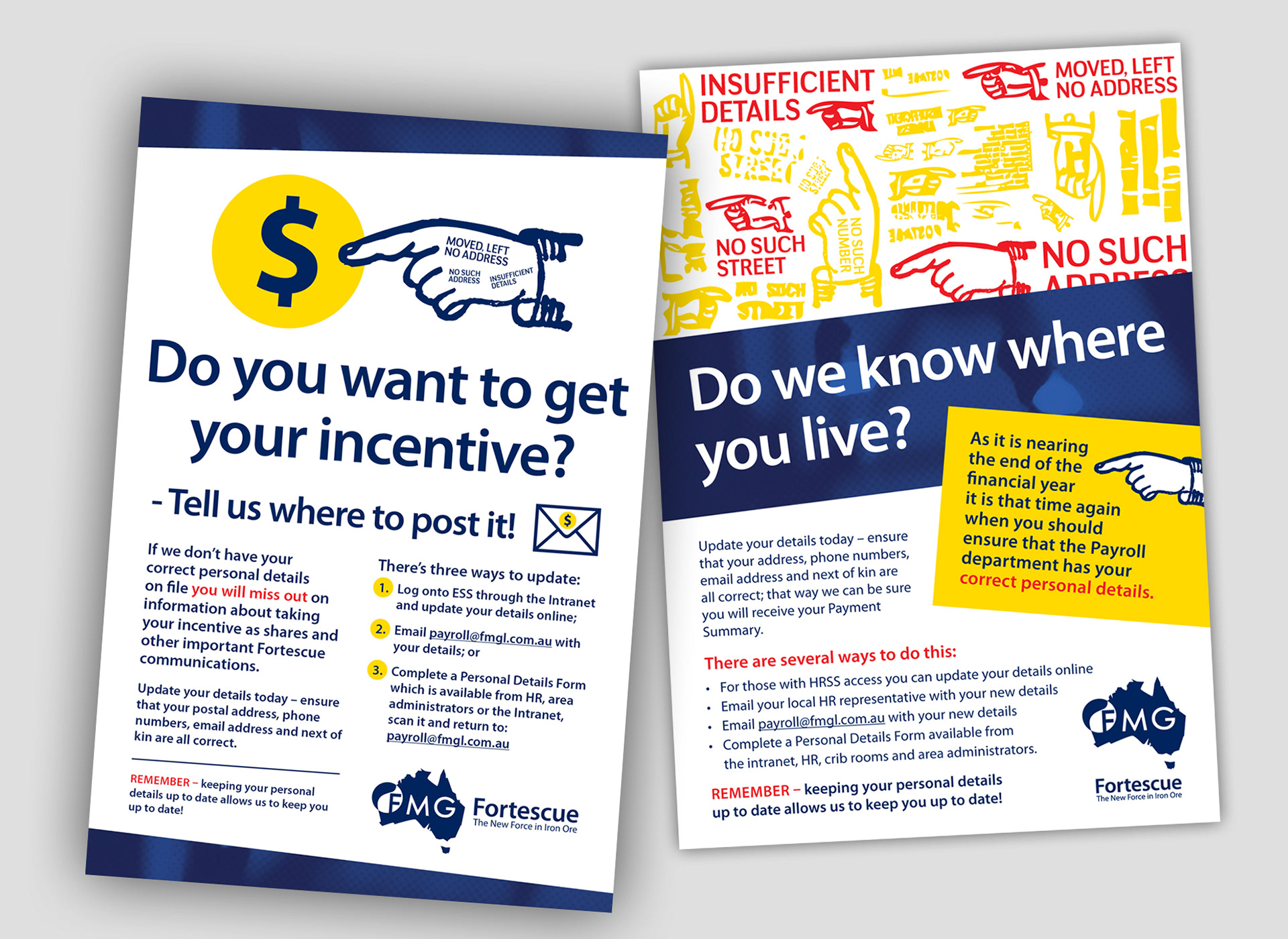 Payroll posters for display around Fortescue sites to speak to an internal staff audience.