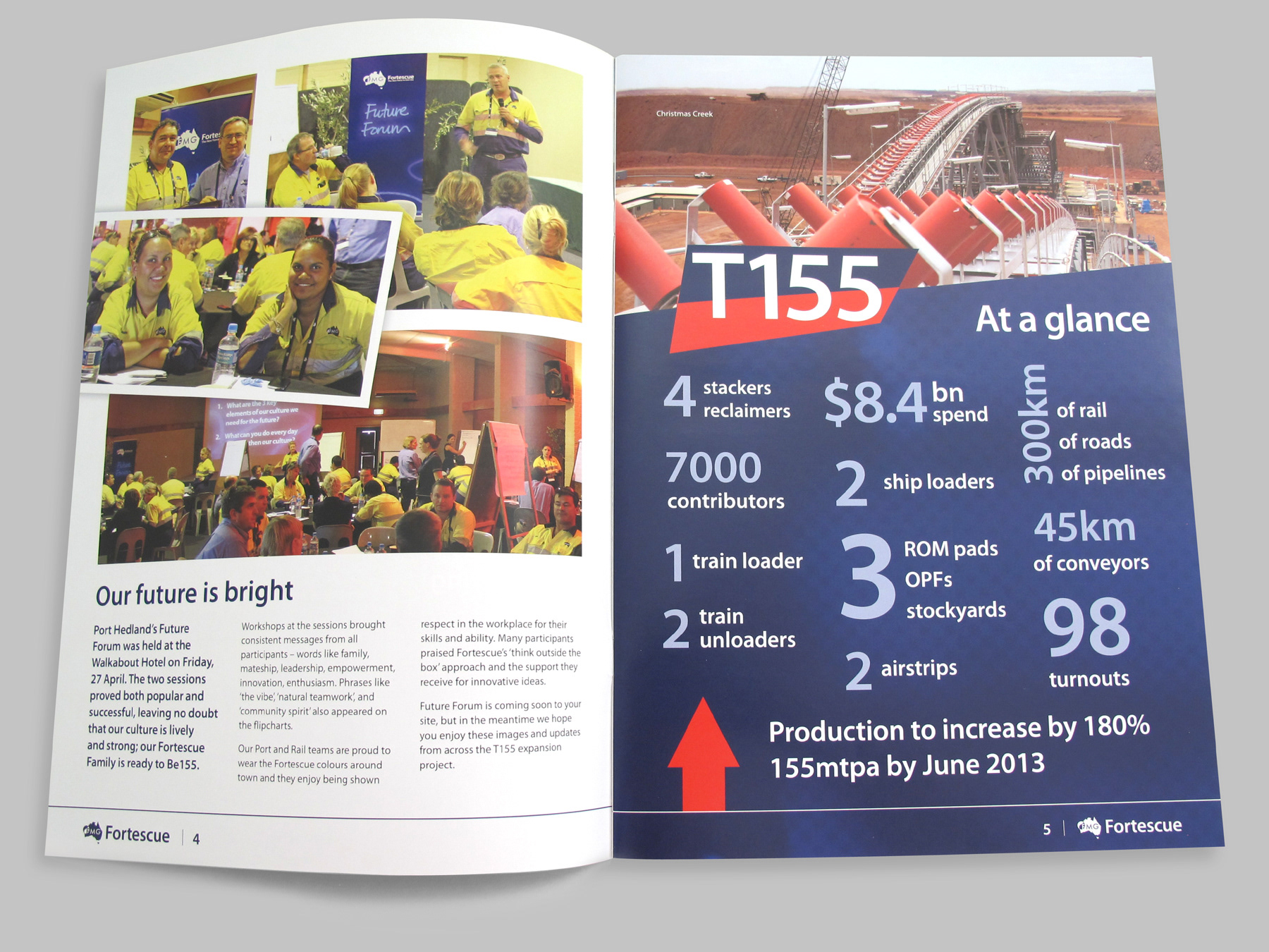 At Fortescue, one of my regular responsibilities was the production of the company magazine, 'The Breakthrough'. The publication had existed in various forms since the company began, but was relaunched in 2011. I started by designing a new masthead to tie in with company branding and set of fluid, informal page layout templates that complimented the friendly and exciting culture of the company. Full PDF versions of the issues I worked on (1 to 8) can be found on Fortescue's website: